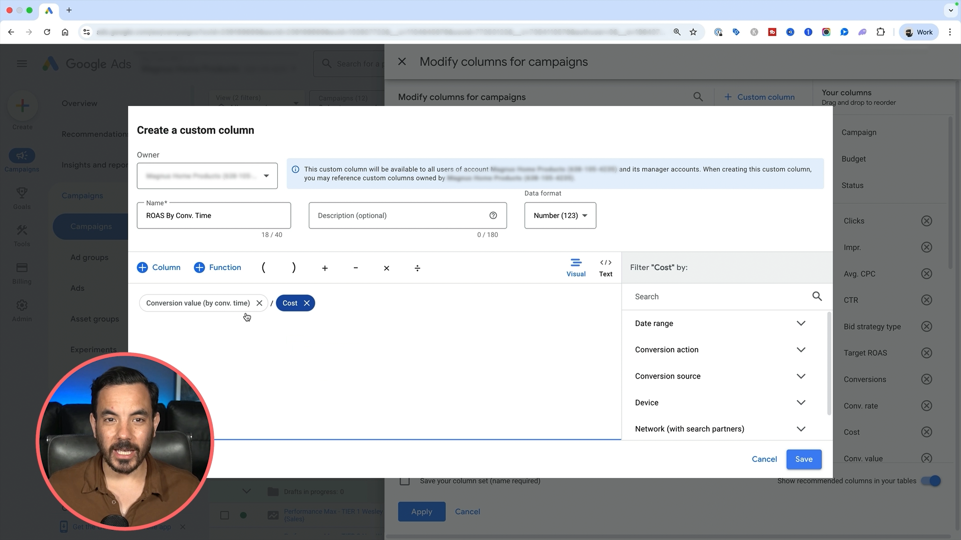 If you’re in ecommerce, you’ll want to create a custom ROAS by conversion time column: